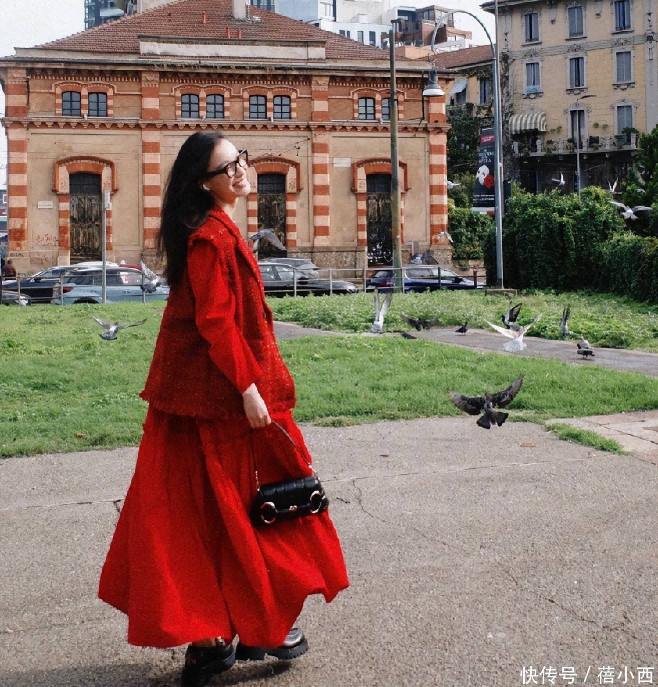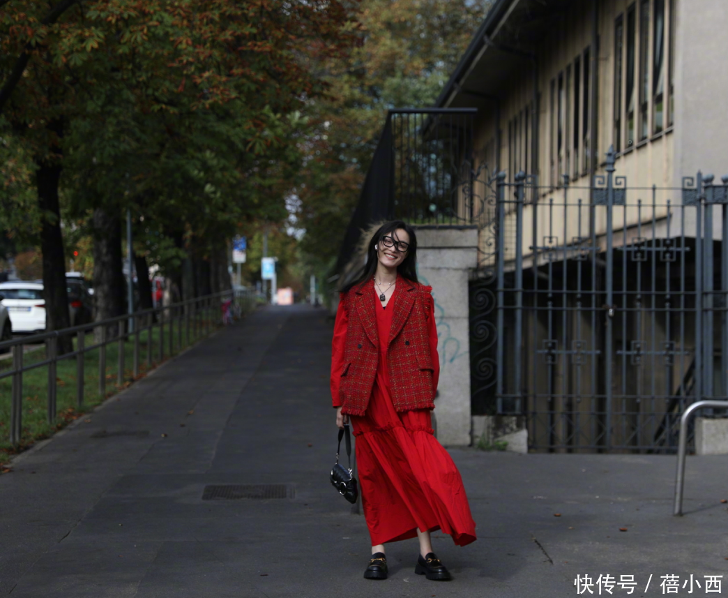 红色连衣裙的裙摆遮住了脚踝,老实说,这种长度不太适合小个子女生,裙长在膝盖上下最为合适了。脚上是一双黑色乐福鞋,鞋底带些厚度,只要鞋底柔软,那么走路就会很舒服。