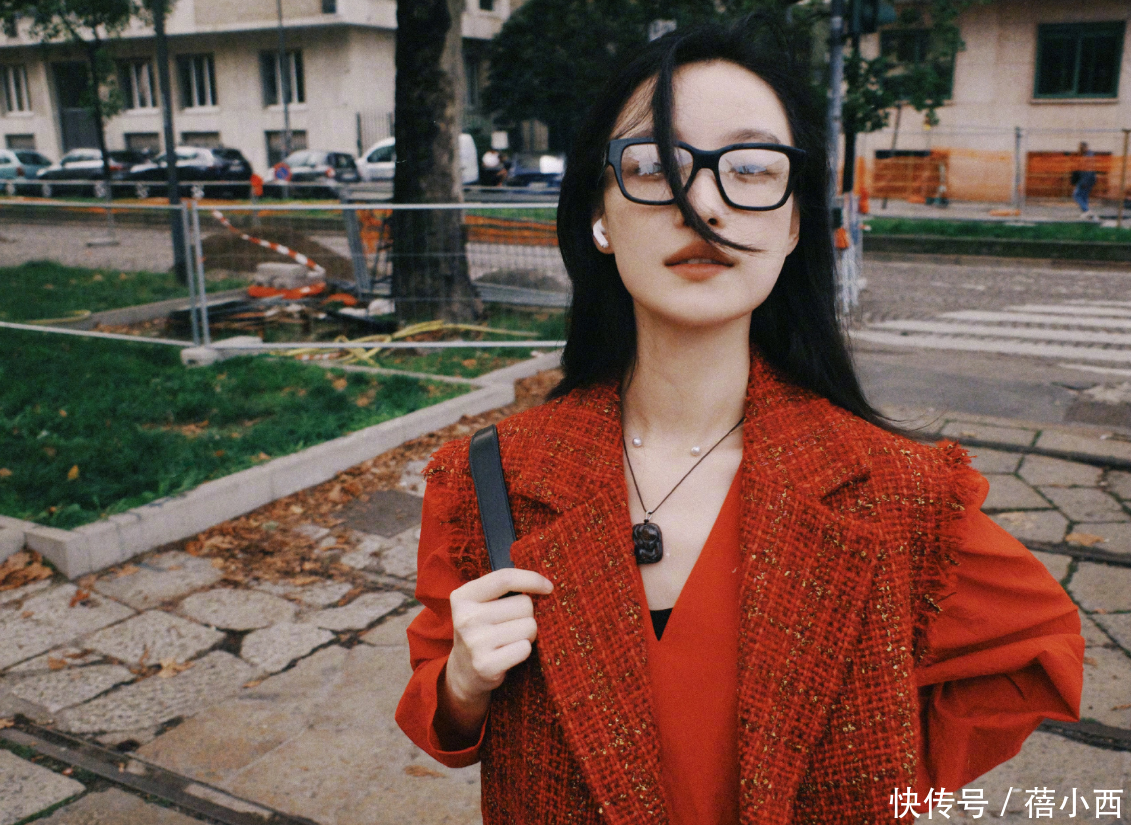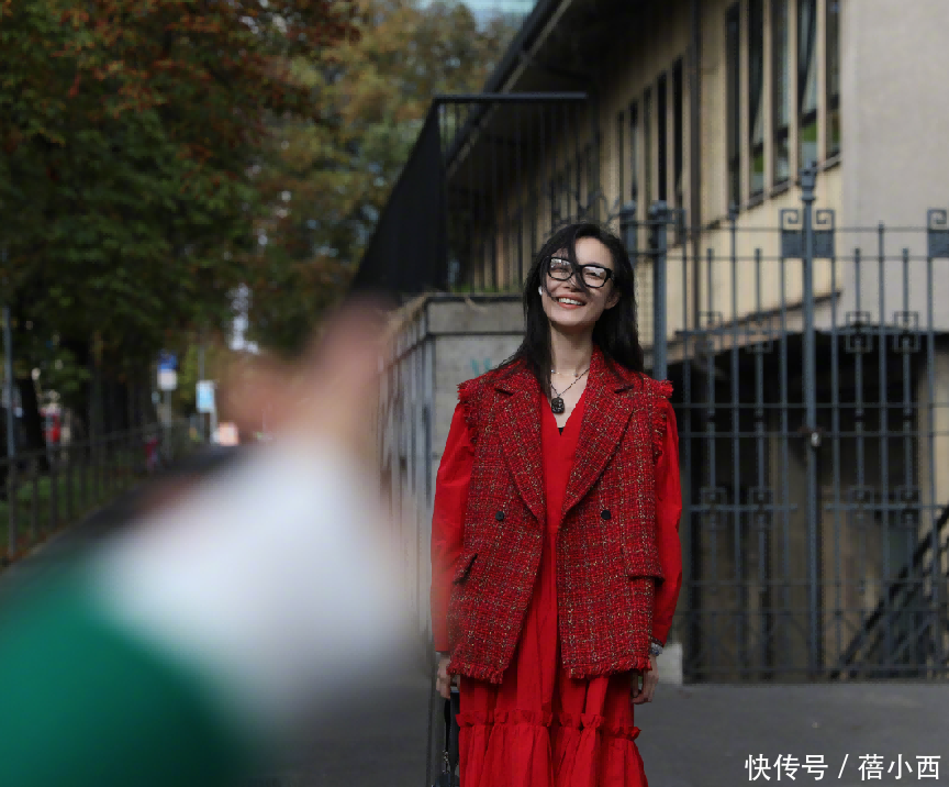 马甲里层搭了一件连衣裙,裙子是V型领口,分分钟衬出天鹅颈;连衣裙颜色为大红色,瞬间吸引众人目光。红裙是长袖设计,可以有效保护双臂,再加上袖子面料与手臂留有一定空间,所以遮肉肉不在话下。